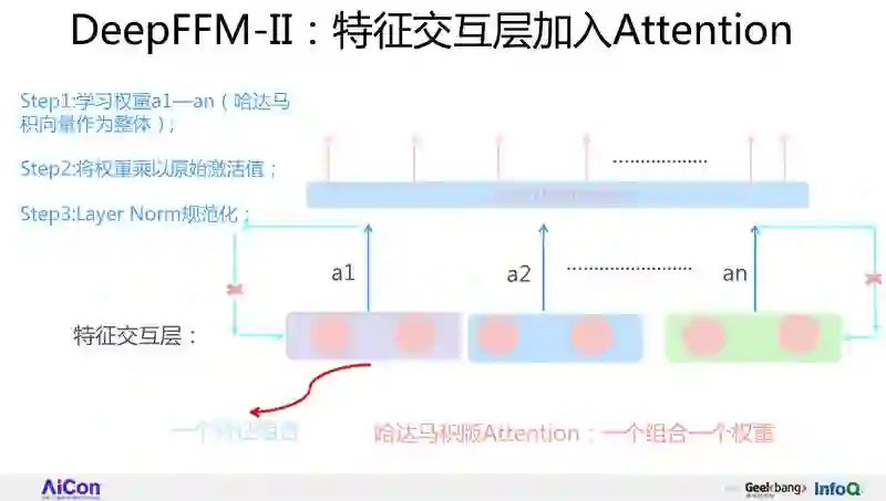再回头讲,我们是怎么改进的。在特征交互层,我们先给出个内积版,这是一个特征组合,组合完是一个值,我给每个两两特征组合的值都加个权重 a1-an,加完权重之后,再把权重乘到值里,再加上 Layer Norm,往上面引层去走,这是第一个改进版本。