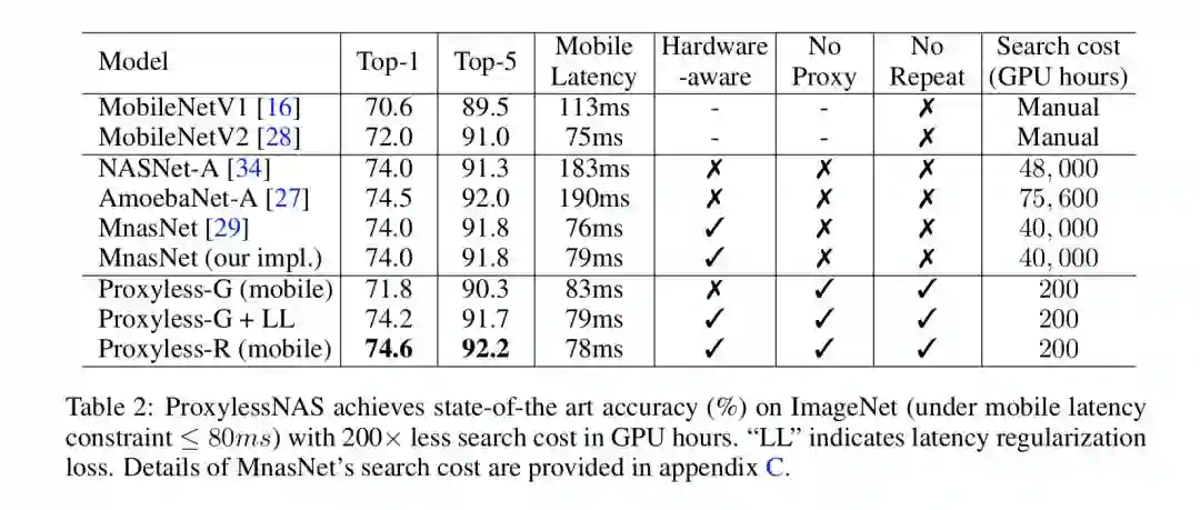 ProxylessNAS 是第一个在没有任何代理的情况下直接学习大规模数据集(例如 ImageNet)上的 CNN 结构的 NAS 算法,同时仍然允许大的候选集并消除重复块的限制。它有效地扩大了搜索空间,实现了更好的性能。