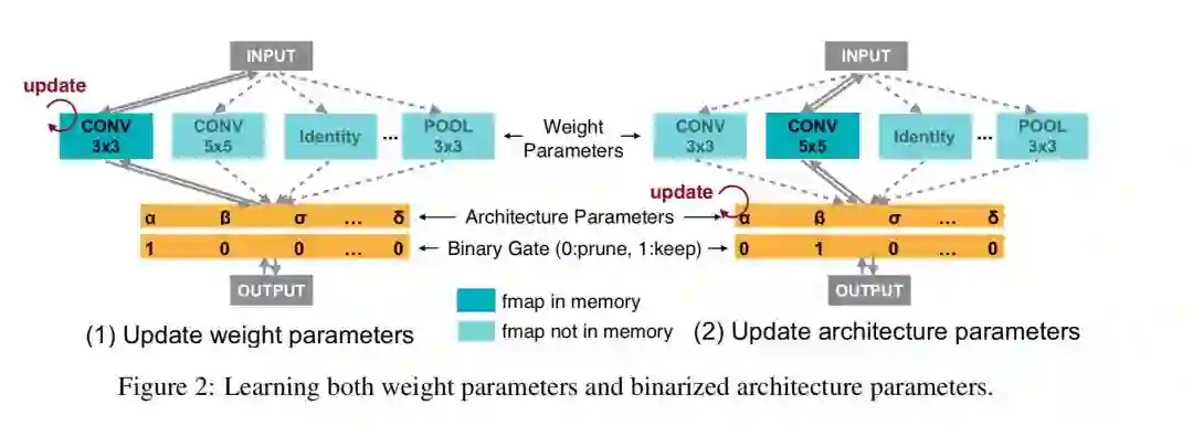 我们为 NAS 提供了一种新的路径级剪裁视角,显示了 NAS 与模型压缩之间的紧密联系(Han et al。,2016)。我们通过使用路径级二值化将内存消耗节省一个数量级。