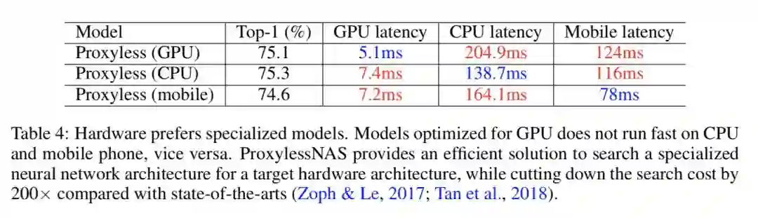 我们提出了一种新的基于梯度的方法(作为一个正则函数),来处理硬件目标(例如延迟)。针对不同的硬件平台:CPU / GPU / FPGA / TPU / NPU,ProxylessNAS 实现了针对目标硬件 CNN 结构定制。据我们所知,这是第一个来研究不同硬件结构下的专用神经网络结构的文章。