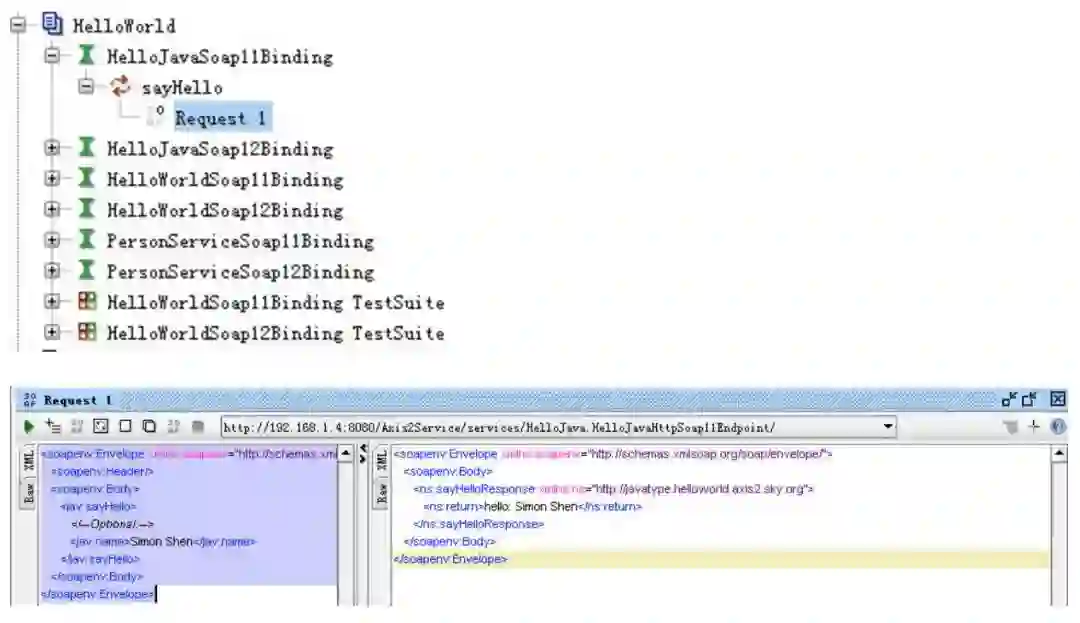 我们把这个Service的wsdl地址导入SOAP UI工具并生成模拟客户端,然后再来看看它的调用与返回值。