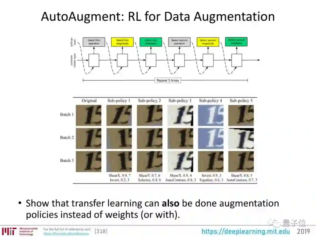 比如说,它自动增强门牌号数据集的时候,会常用剪切、平移、反转颜色等方法,而在ImageNet这种自然照片数据集上,就不会剪切或者翻转颜色,只会微调颜色、旋转等等。