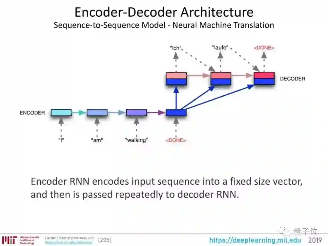上图展示了一个用于神经机器翻译的序列到序列(seq2seq)模型。RNN编码器负责将输入序列编码成固定大小的向量,也就是整个句子的“表征”,然后把这个表征传递给RNN解码器。