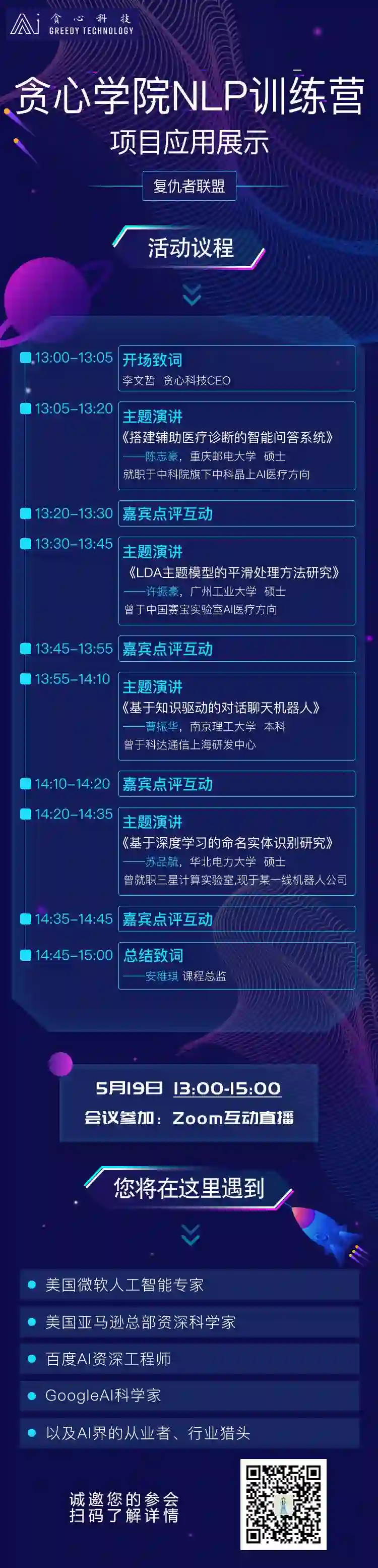 2019年贪心学院的《NLP自然语言处理训练营》成为了震撼业界的标杆。我们培养的NLP算法工程师已经走上相应工作岗位,而我们期待着他们将为2019年的中国NLP技术带去新鲜的血液和希望。(每期仅有不到30人能通过审核加入训练营)