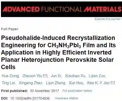 通过旋涂制备好钙钛矿薄膜后,使用硫氰酸铵(NH4SCN)后处理,钙钛矿薄膜经过分解,再重新结晶的过程,形成了晶粒更大,结晶性更好,缺陷更少的钙钛矿薄膜。这项研究工作于2017年11月发表在国际重要期刊Advanced Functional Materials(影响因子12.12)。题目“类卤素诱导的CH3NH3PbI3薄膜的重结晶工程及其在高效反型平面异质结钙钛矿太阳能电池中的应用”。第一作者为课题组青年教师董化博士(交大为第一作者单位与通讯作者单位),文章被推荐为当期的封底文章。