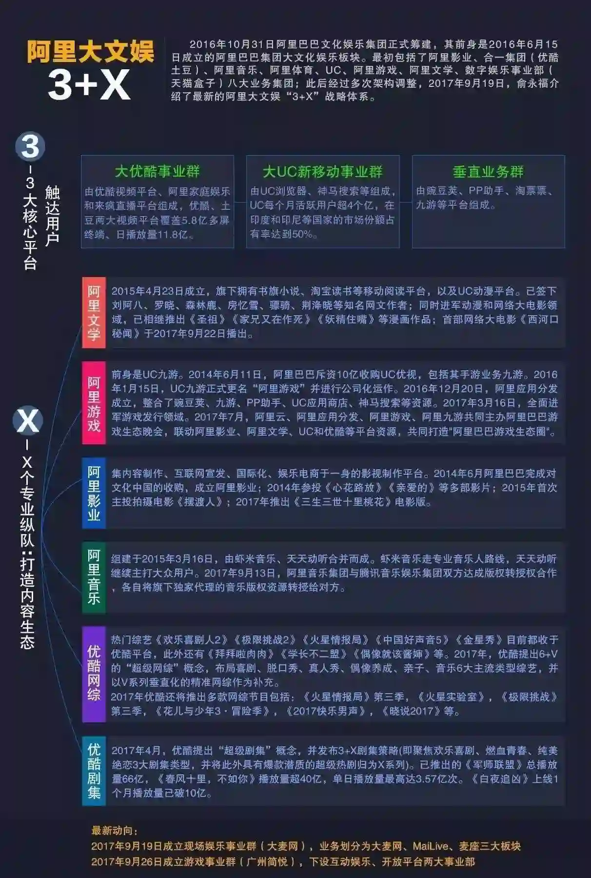 阿里巴巴大文娱从架构上在2016年下半年形成了“3+X”的业务矩阵。3个核心分发平台分布是:优土视频平台、UC事业群(UC浏览器+神马搜索)、垂直业务群(APP分发及票务游戏分发平台)三大分发平台,以及辅助性的X个内容,包含阿里文学、阿里游戏、阿里影业、阿里音乐、优酷网综电视剧等。