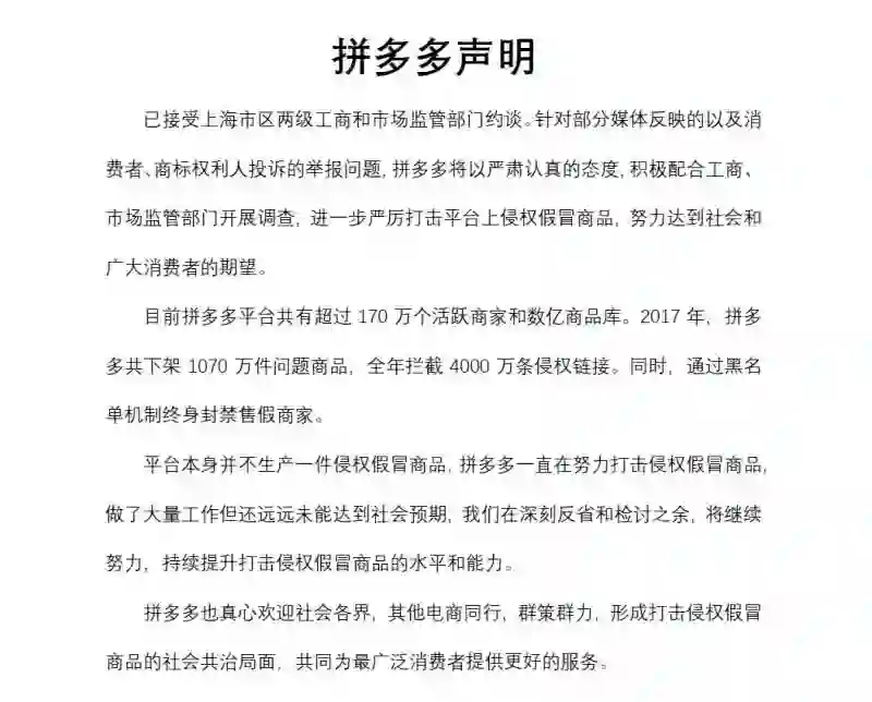 对此,拼多多发声明表示已经接受工商和市场监管部门约谈,并表示将全力配合工商、市场监管部门开展调查,进一步严厉打击平台上侵权假冒商品,努力达到社会和广大消费者的期望。(虎嗅网、新京报)
