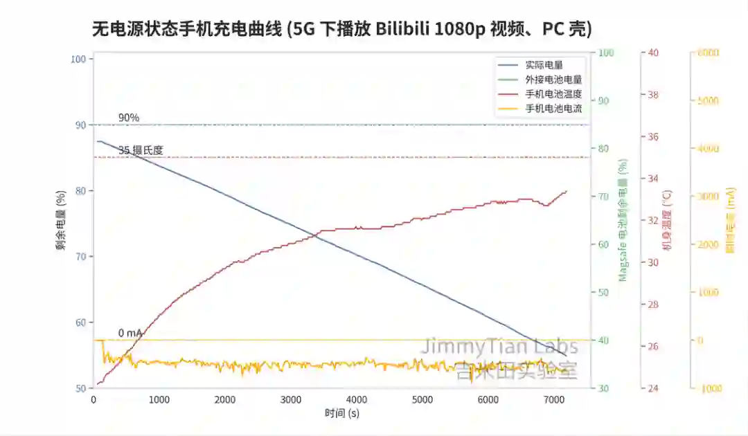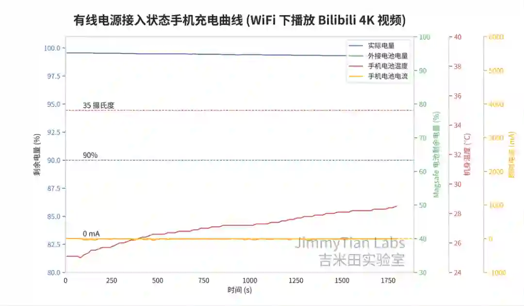 有线测试中可以发现,虽然手机没在充电,但温度还是在缓慢提升的,这代表播放 4K 视频的发热已经超过了手机本身的散热能力,热起来只是时间问题。