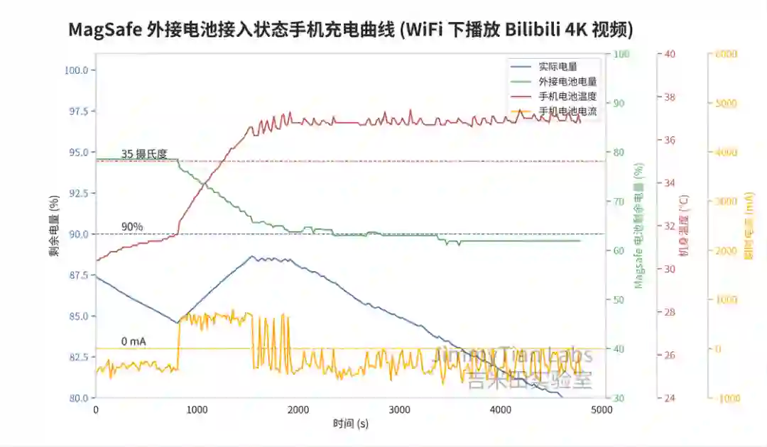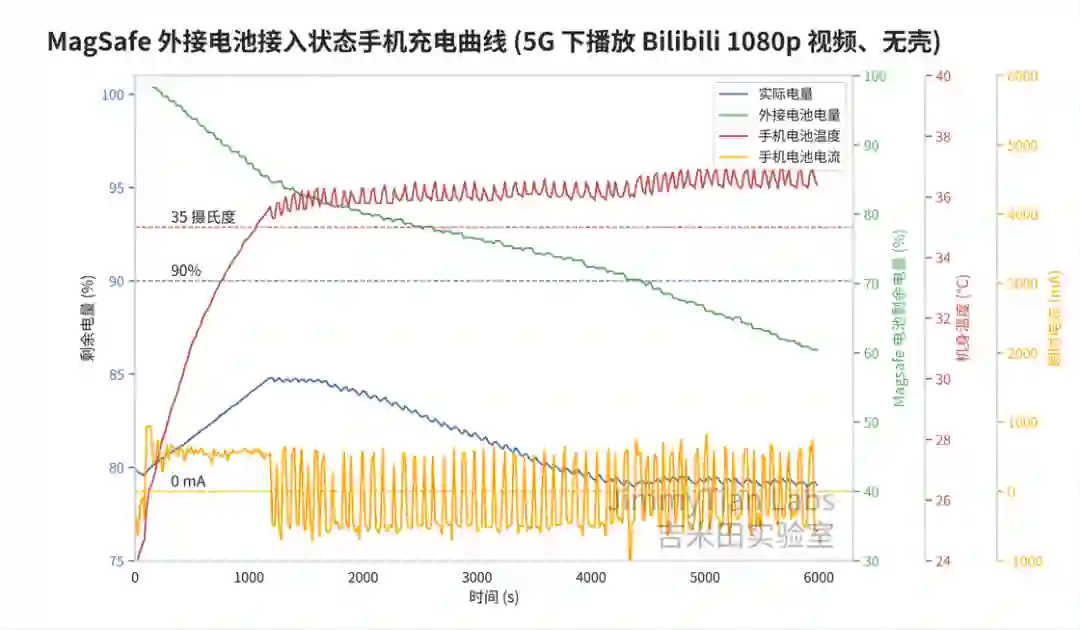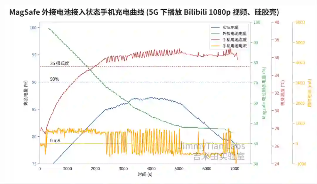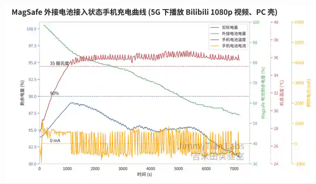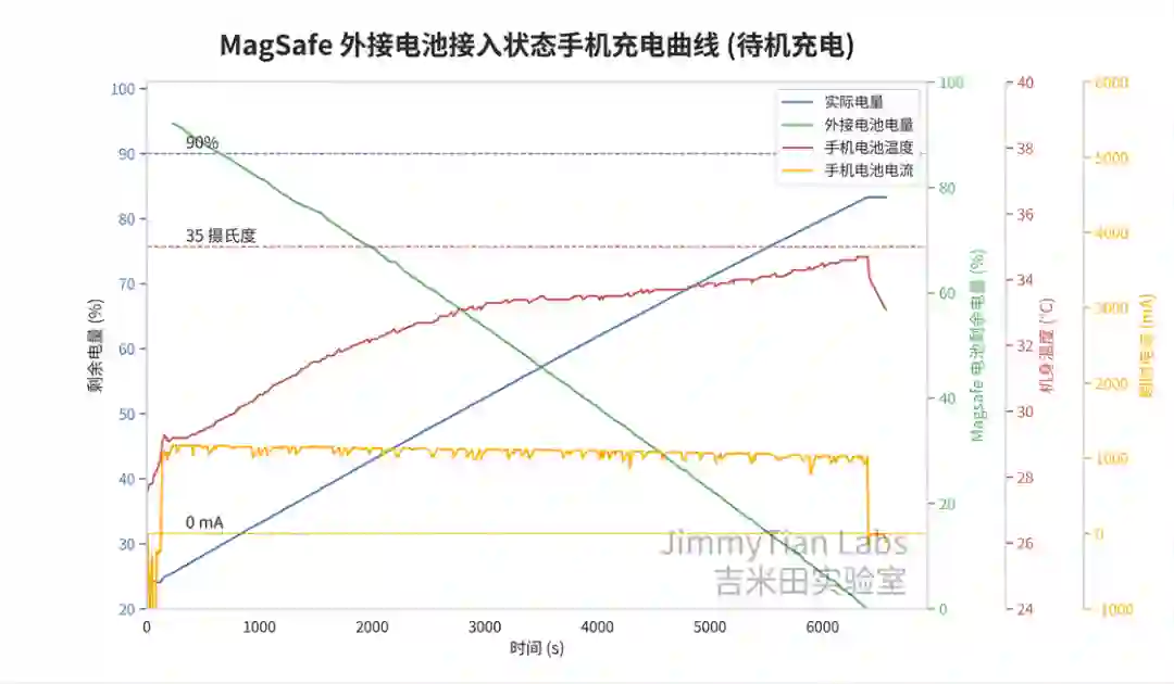 ,也没有通过电池的电流,那么有没有可能,当我们选择充电超过 90%,充满之后会直接从外接电池取电呢,再做一次测试。
