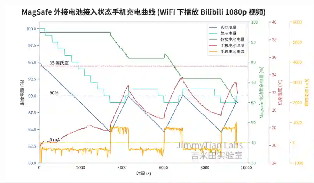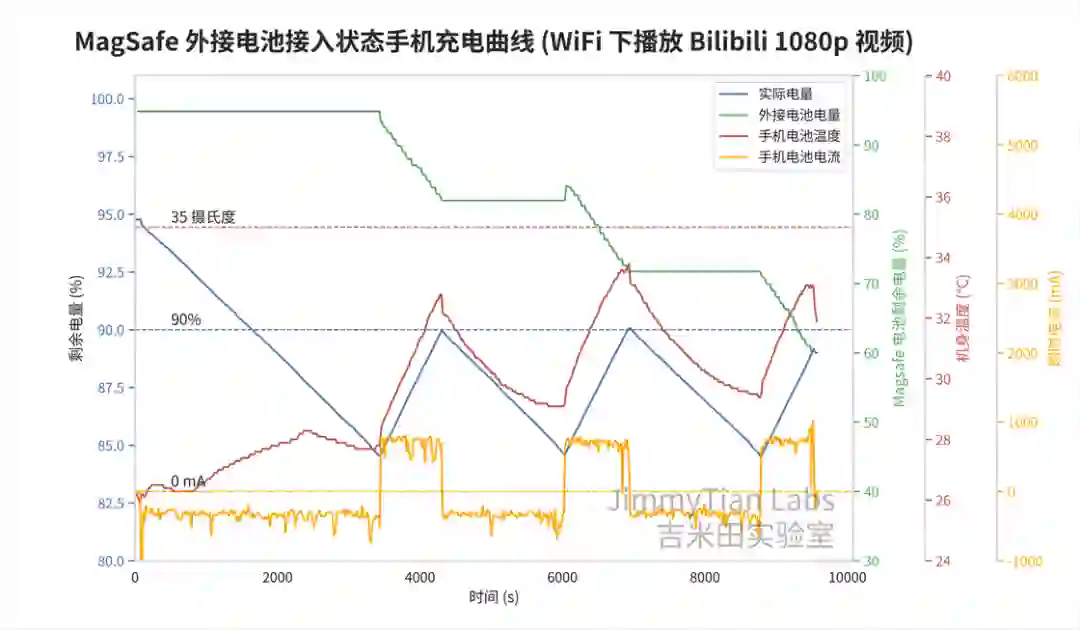 结果温度一上来,触发了高温保护,MagSafe 电池直接下班了,手机电量便一直往下掉,这说好的把电量维持在 90% 呢?
