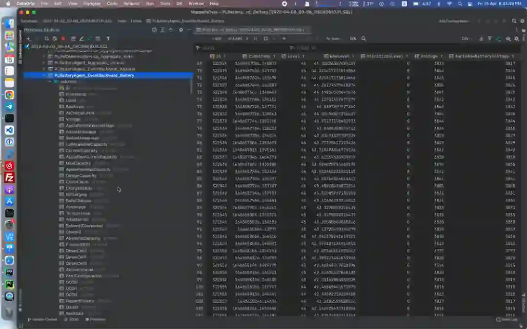 这个数据库里有足足 527 个表,单单 Battery 这一个表就有 84 列,记录着详细的电池数据,连电池百分比都是详细到小数点后 15 位的,这下保修是保住了。