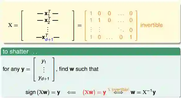 shatter的本质是假设空间H对X的所有情况的判断都是对的,即总能找到权重W,满足X∗W=y,。由于这里我们构造的矩阵X的逆矩阵存在,那么d维的所有inputs都能被shatter,也就证明了第一个不等式。