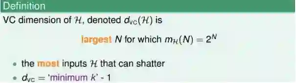 VC Dimension就是某假设集H能够shatter的最多inputs的个数,即最大完全正确的分类能力。(注意,只要存在一种分布的inputs能够正确分类也满足)。