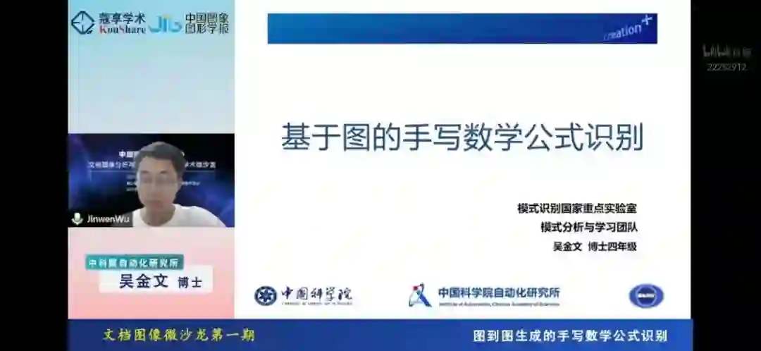 中国图象图形学学会文档图像分析与识别专业委员会学术微沙龙(简称:文档图像微沙龙)第一期活动于2021年9月1日成功举行。文档图像微沙龙由中国图象图形学学会主办,文档图像分析与识别专委会承办,中国图象图形学报协办。微沙龙首期活动邀请中国科学院自动化研究所博士研究生吴金文作为报告嘉宾,介绍了他在手写数学公式识别方面的研究进展。本次活动在B站、中国图象图形学报视频号进行了同步直播,人气峰值达到3000以上。
