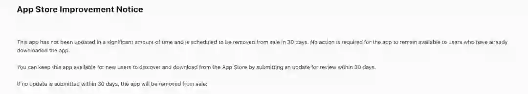 值得注意的是,苹果官方并没有说清楚此次“评估 App”的标准,根据开发者的反馈来看,只要是两年没有更新的应用或都会受到影响。