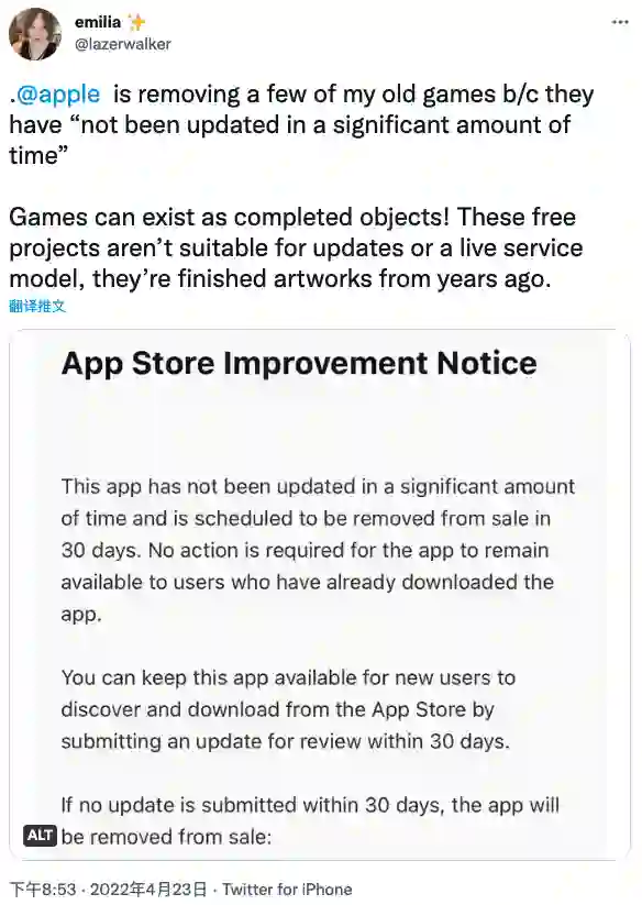 另一位开发者 Emilia 表示,“苹果正在删除我的一些旧游戏,只因它们没有在一定时间内进行更新。”在 Emilia 看来,游戏可以作为已完成的对象而独立存在于 App Store 中。这些免费的项目不适合经常更新或者以 Live Service 模式(一种“游戏服务”,即在游戏本体发行后,为其制定长期的DLC支持计划,吸引玩家回归或保持游戏热度的一种运营方式)。