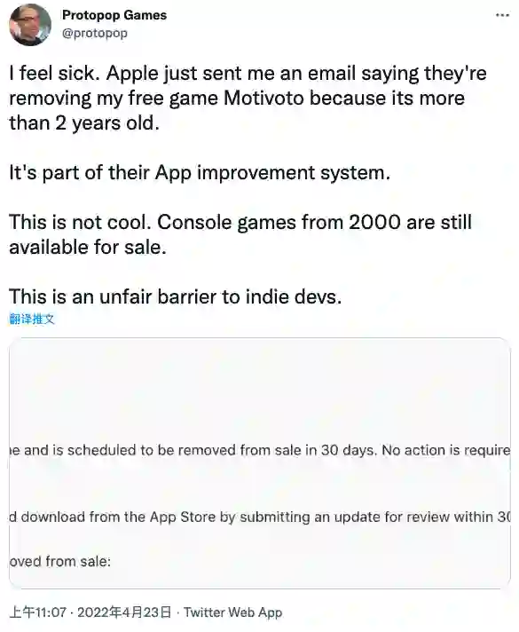 “我觉得很恶心。苹果刚刚给我发了一封邮件,说他们要删除我的一款免费游戏——Motivoto,只因为距离它上一次更新时间已经超过两年。”