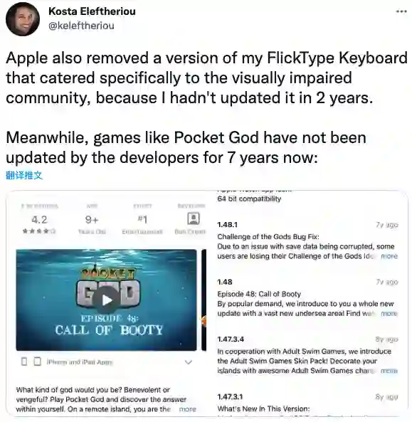 同时,他指出,像 Pocket God(《口袋上帝》)这样的游戏已经 7 年没有更新了,但是它仍然被保留在 App Store 中。