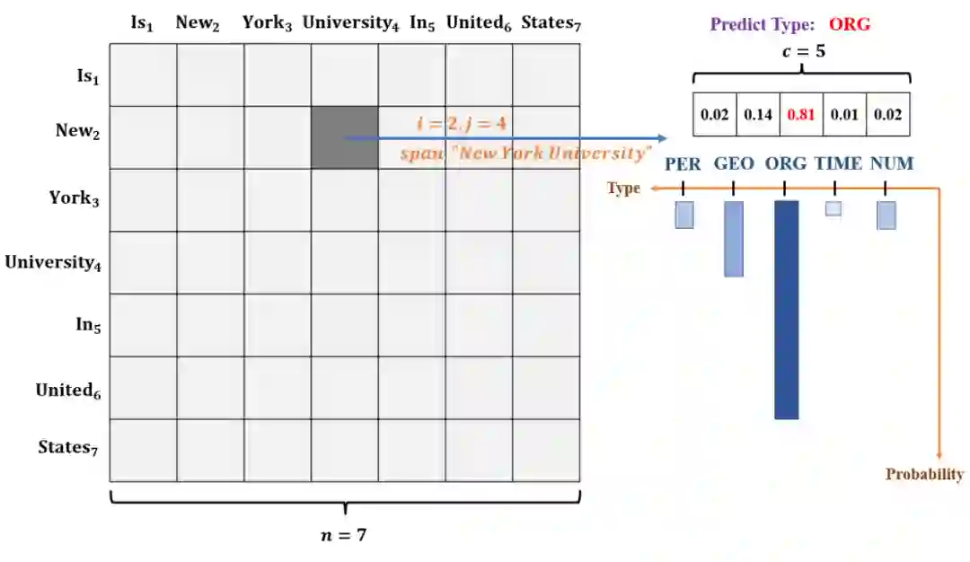 本文跟进了《Named Entity Recognition as Dependency Parsing》这一论文的工作,同样采用了基于片段分类的解决方案。该论文提出采用起始和结束词来指明(pinpoint)对应片段,并利用双仿射解码器(Biaffine Decoder)来得到一个评分矩阵(score matrix),其元素(i , j)代表对应片段(开始位置为第 i 个词,结束位置为第 j 个词)为实体的分数。这一基于片段的方法在计算上易于并行,因此得到了广泛的采用。