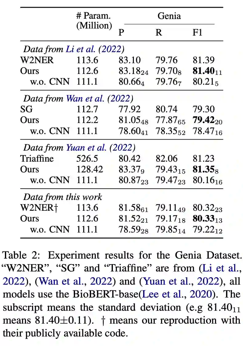 CNN-NER 采用 RoBERTa-base 作为编码器,分别在 ACE2004、ACE2005 数据集上取得了 87.31 和 87.42 的平均 F1 值;采用 BioBERT-base 作为编码器,在 Genia 数据集上取得了 80.33 的平均 F1 值。此外从实验结果来看,采用不同的分句方式进行预处理会影响模型的性能,因此作者开源了一个统一的预处理脚本,用于呼吁和促进今后的工作进行更方便、更公平的比较。
