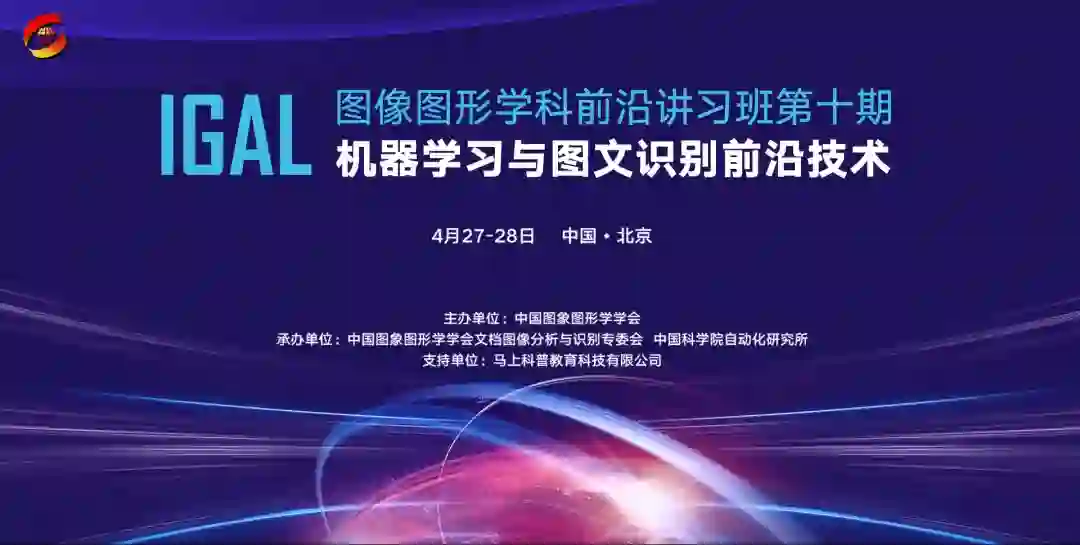 第10期CSIG图像图形学科前沿讲习班(Advanced Lectures on Image and Graphics,简称IGAL)于2019年4月27日-28日在北京举办,本期讲习班的主题为“机器学习与图文识别前沿技术”,由华南理工大学金连文教授担任学术主任。邀请多名国内机器学习、文字识别、计算机视觉领域的知名专家作特邀报告,介绍包括复杂版面文档图像分析与理解、机器学习公理化的研究现状与未来发展趋势、面向物理世界的强化学习理论与技术及落地应用、基于通量表示的骨架检测新方法、弱监督视觉理解及弱监督学习模型、人工智能驱动的视觉计算(视觉结构学习、视觉语义分析和理解等)、图神经网络及图匹配技术、自然场景中任意形状文字的检测和识别等一系列有特色的前沿技术。使学员了解机器学习、图文识别、计算机视觉等领域的前沿理论方法和最新进展,提高学术水平的同时,增强与机器学习和图文识别领域顶尖学者之间的学术交流。