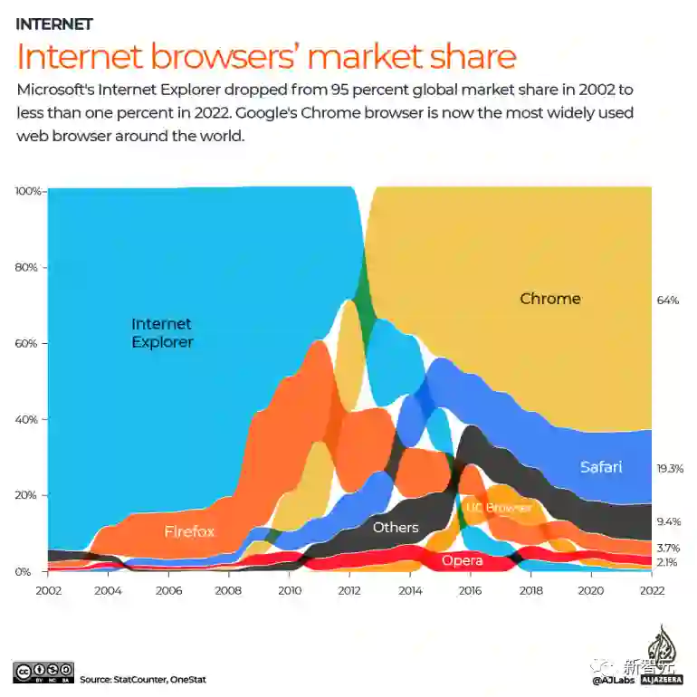最可怕的是,2012年底,Chrome取代了IE浏览器,成为了新一代浏览器之王,占据了绝大部分的份额。而这个地位,Chrome到今天依旧坚挺得保持着。