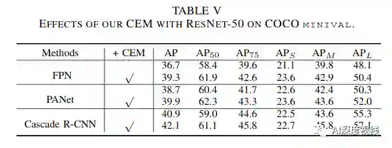 最重要的是,我们的AC-FPN可以轻松插入现有的基于FPN的模型中。关于目标检测和实例分割的大量实验表明,带有我们提出的CEM和AM的现有模型大大超过了没有它们的同类模型,并且我们的模型成功获得了最新的结果。