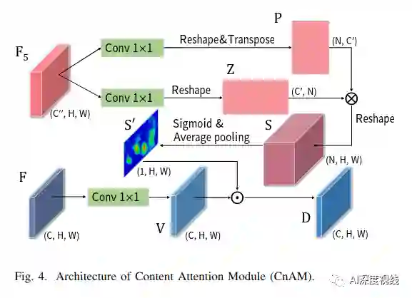 由于CEM中可变形卷积的影响,给定图像的几何特性被破坏,导致位置偏移。为了解决这个问题,我们设计了一个新的注意模块,称为内容注意模块(CnAM),以保持每个目标的精确位置信息。如下图所示,与CxAM类似,我们使用卷积层来转换给定的特征映射。但是,我们没有使用特征图F来产生注意矩阵,而是使用特征图F5∈R(C”xHxW),这样可以捕捉到每个物体更精确的位置。