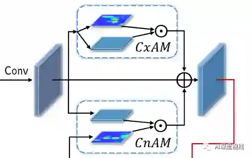 第二个模块是注意力引导模块(AM),为了处理冗余的上下文关系可能导致的误定位和误识别。该模块可以通过使用注意力机制来自适应捕获对象的显著依赖性。AM由两个子模块组成,即上下文注意模块(CxAM)和内容注意模块(CnAM),它们分别专注于捕获区分性语义和定位精确位置。