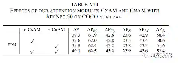 由下表X和XI可以看出,ACFPN较FPN增加的有限的计算复杂度,但精度确提升明显: 骨干网络为ResNet50 时,ACFPN完成一次迭代所需的时间为1.18s,虽然较FPN的0.92s多了0.26s的时延,但精度可以提升3.2个百分点。如果对精度要求较高的场景,可以采用本文的改进策略,并且ACFPN在ResNet-50骨干网络情况下,可以超过FPN在ResNet101骨干网络下的AP精度,且参数量要更低,时间也更快。