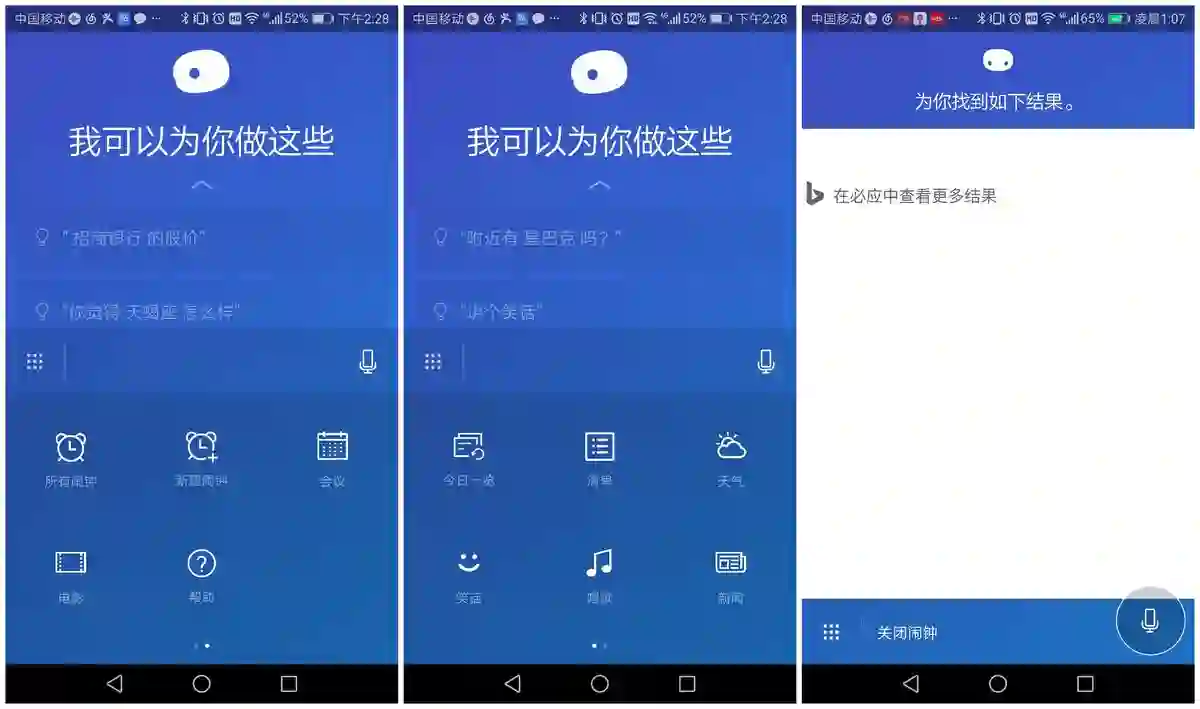 这是笔者在自己某品牌安卓手机(其有自带的语音助手)上用的小娜app,左边两张图是小娜仅有的功能,最右图为我命令它“关闭闹钟”,但它跳转搜索后,也没有识别出选项