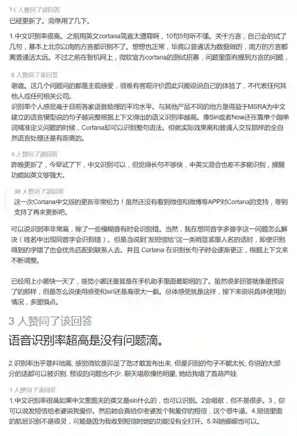在挑剔的知乎上,这款中文版语音助手基本零差评,而“中文语音识别率高”也成了小娜用户的“统一口径”;此外,它也在很多新媒体对诸多语音助手的视频评测中获得了“碾压Siri”“比Google Now好一些”“微软小娜把Siri和Google Now怼的好惨”等正面评价。
