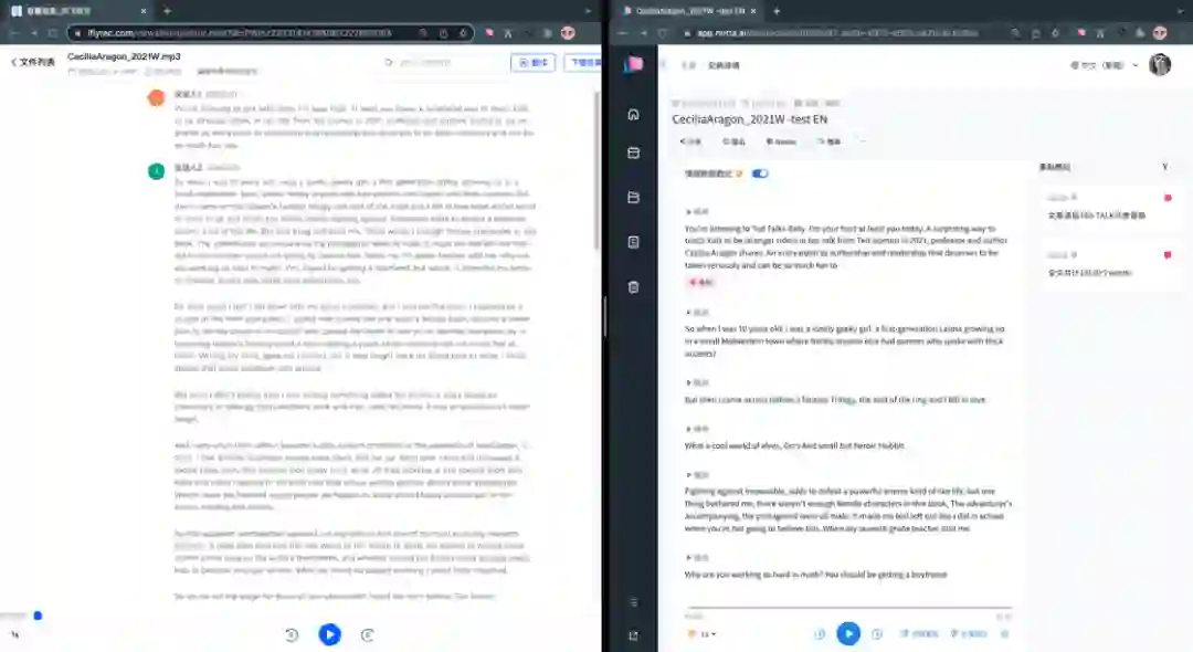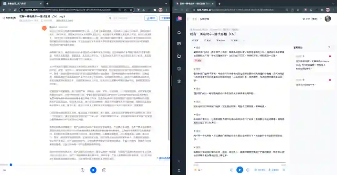 但如果观察转写界面就会发现。Notta 将文本切得更细,每段/每句后都直接附上了原声语音切片。讯飞则直接呈现了完整的段落。如果后期工作需要以编辑校对为主,尤其是相关术语近音词可能造成歧义的,切得细的相对容易进行二次校验。至于段落完整的,则更适合阅读,算是应用取向的差异,各有千秋。在文末可以获取转写原文对比。