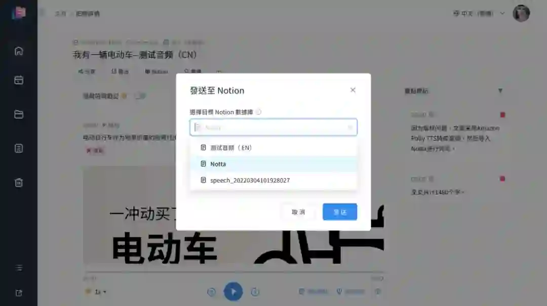 在最近一周的更新中,Notta 的网页端和移动端陆续支持了推送到 Notion 的功能。