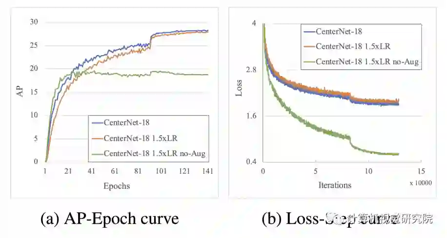 较大的学习速率不能帮助CenterNet更快地收敛,并且删除数据增强会导致性能变差。根据上面的结论,我认为这是因为CenterNet在训练过程中只在目标中心编码一个单一的回归样本。这种设计使得CenterNet在很大程度上依赖于数据增强和较长的训练时间,导致不友好的训练时间。