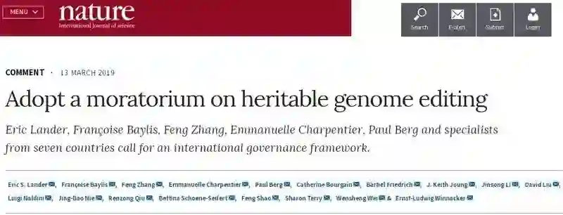 3 月 13 日,来自 7 个国家的 18 位科学家在 Nature 发表评论文章(doi: 10.1038/d41586-019-00726-5 ),呼吁全面暂停人类生殖系基因编辑的临床应用,并用这段时间认真反思、广泛讨论,共同建立一个国际框架。