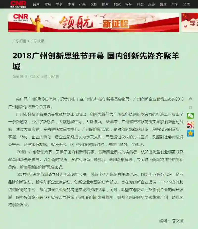 感谢活动指导单位广州科技创新委员会,主办方广州创新企业联盟,承办单位广州启迪中海科技园及南方网、中国报道、广州电台、羊城晚报、新快报、央广网、南方日报、腾讯新闻、广州交通电台、广东科技报、中国报道网、广州电视综合频道、澳门商报、广州日报、界面广东等媒体对本次广州创新思维节的大力支持。