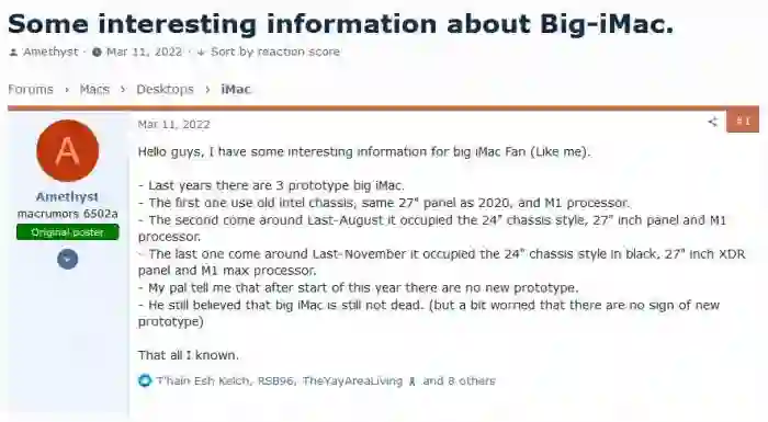 今年 3 月,国外科技媒体 MacRumors 上论坛网友 Amethyst 透露,苹果在去年制作了至少 3 款采用 Apple Silicon 芯片的更大尺寸 iMac 原型。该网友表示从一位内部知情人士处获得了这些原型的细节信息。