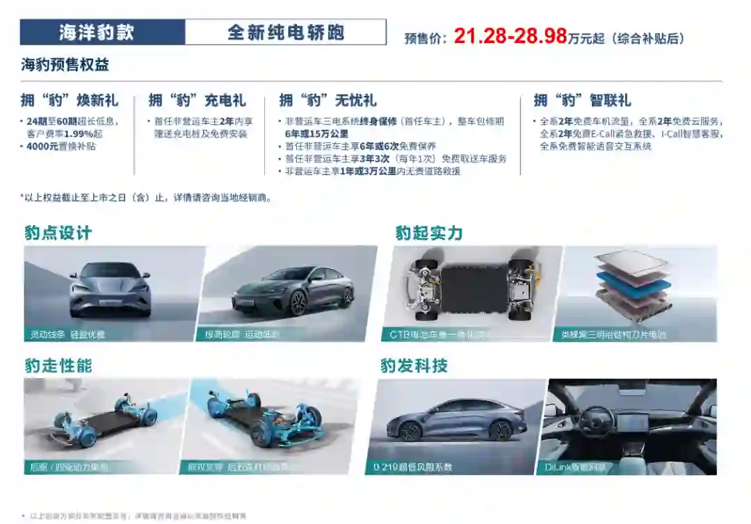 比亚迪海豹价格:550km 标准续航后驱精英 20.98 万元;550km 标准续航版后驱尊贵 22.28 万元;700km 长续航后驱版 25.98 万元;650km 四驱性能版 28.68 万元。