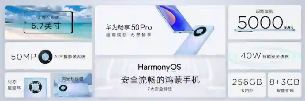值得一提的是,在 HarmonyOS 的加持下,华为畅享 50 Pro 具备 7 大安全特性,为用户带来三大智慧体验,畅连通话支持高清音视频通话,能连接手机、平板、手表、智慧屏等设备,支持最多 12 方通话。