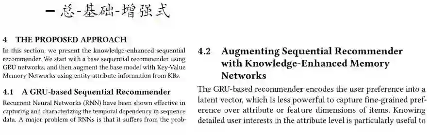 第 2 篇发表在 SIGIR 2018 上,是基于知识属性的序列推荐算法。赵鑫指出,为了帮助论文初学者们快速入门,他接下来的内容风格可能会有点像“八股文”:按照论文的撰写顺序,介绍每一个部分该怎么写,有哪些规范、技巧或教训等。