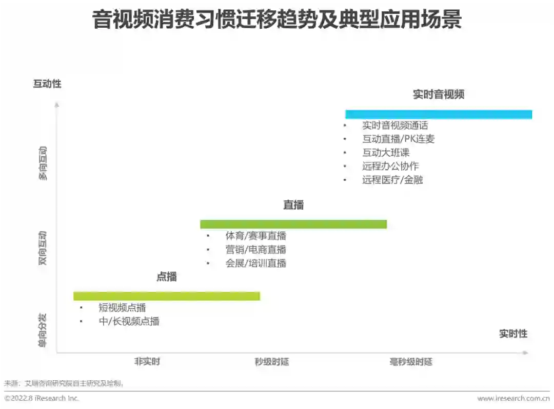 而得益于底座能力与关键技术的持续突破,音视频服务体系正逐步从点播、直播到实时音视频深化发展。实时性与互动性的长足需求与优化,逐步激活了更多场景下的音视频互动模式,驱动用户的音视频消费习惯向更加还原真实、更加沉浸式的实时音视频服务迁移。