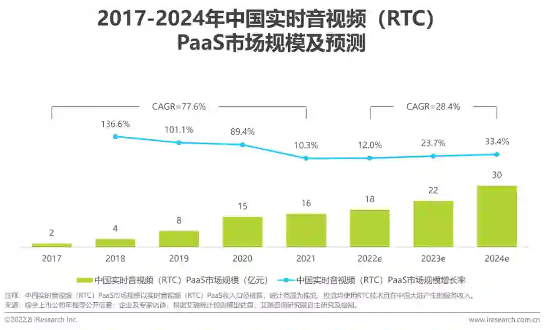 根据艾瑞咨询发布的《2022年中国实时音视频行业研究报告》显示,2021年中国实时音视频(RTC)PaaS市场规模为16亿元,同比增长10.3%。受社交娱乐头部应用的高度渗透及“双减”政策的持续影响,预计未来三年的复合增长率为28.4%,2024年实时音视频(RTC)PaaS市场规模将达到30亿元。