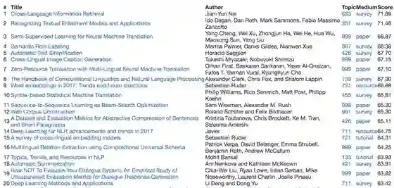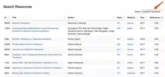 我们网站的另一个令人振奋的功能是基于标题和摘要对来推荐资源。通常情况下,你可能会被指派一项任务,或者对一个项目有一个早期的想法,并且需要找到资源来推进你的想法。基于这个出发点,我们想为你推荐一些资源来完成你的项目,比如编写一个由tutorial组成的参考书目。要使用此功能,请访问Dashboard【7】(需要登录)并单击“Public Projects”以查看示例,或者点击“My Projects”创建你自己的项目。除了来自我们语料库的相关资源列表之外,我们还推荐基于文本匹配的分类主题。我们计划通过探索标题和抽象对之间的关系来改进当前的baseline。示例输出如下:
