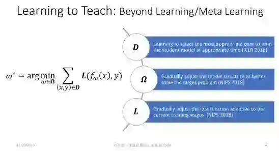 但是为什么训练数据集 D、损失函数 L 和模型参数空间 Ω 必须人为预先给定?如果不实现给定,而是在机器学习过程中动态调整,会变成什么样子?这就是所谓的 Learning to Teach。我们希望通过自动化的手段,自动调节训练数据集 D、损失函数 L 和模型参数空间 Ω,以期拓展现有机器学习的边界,帮助我们训练出更加强大的机器学习模型。