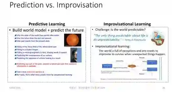 我们希望在我们的眼里,世界的熵在降低。我们对它了解越多,它在我们的眼里的熵越低。同时,我们希望当环境发生变化时,比如意外发生时,我们有能力即兴地去处理。这张PPT 里面描述的即兴学习框架就是我们在跟环境互动,以及在做各种思想实验,通过无监督的方式自我学习应对未知异常的能力。