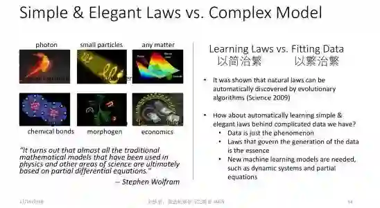 机器学习的学者也要思考一下,以繁治繁的深度学习真的是对的吗?我们把数据看成上帝,用那么复杂的模型去拟合它,这样的思路真的对吗?是不是有一点舍本逐末了?以前的这种以简治繁的思路,从来都不认为数据是上帝,他们认为背后的规律是上帝,数据只是一个表象。