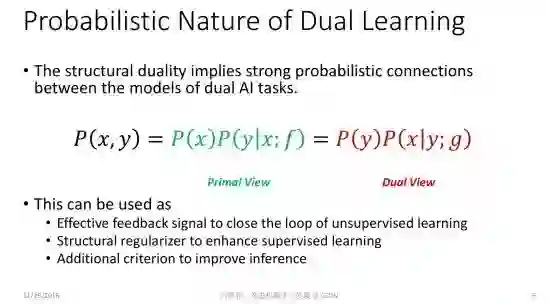 首先,我们看看对偶学习。对偶学习主要是为了解决现有深度学习方法对训练数据过度依赖的问题。当我们没有标注好的训练数据时,是否还能做有意义的机器学习?在过去的几年里,人们做了很多尝试,比如无监督学习、半监督学习等等。但是无论如何,大家心里要清楚,只有有信号、有反馈、才能实现有效的学习,如果我们对这个世界一无所知,我们是不能进行有效的学习的。