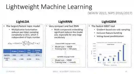 第三个轻量型机器学习的算法叫 LightGBM,这个工具是 GBDT 算法迄今为止最高效的实现。LightGBM的背后是两篇 NIPS 论文,其中同样包含了很多技术创新,比如 Gradient-based one-side sampling,可以有效减少对样本的依赖; Exclusive feature bundling,可以在特征非常多的情况下,把一些不会发生冲突的特征粘合成比较 dense 的少数特征,使得建立特征直方图非常高效。同时我们还提出了 Voting-based parallelization 机制,可以实现非常好的加速比。所有这些技巧合在一起,就成就了LightGBM的高效率和高精度。