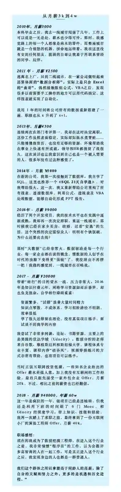 我希望你们看看下面的这个案例。从月薪三千到月薪四万,中间还经历了一次“降薪”。但他的经历实际上并不特殊,更像是每一个职场人的缩影。为了保证故事真实性,我保留了第一人称叙述: